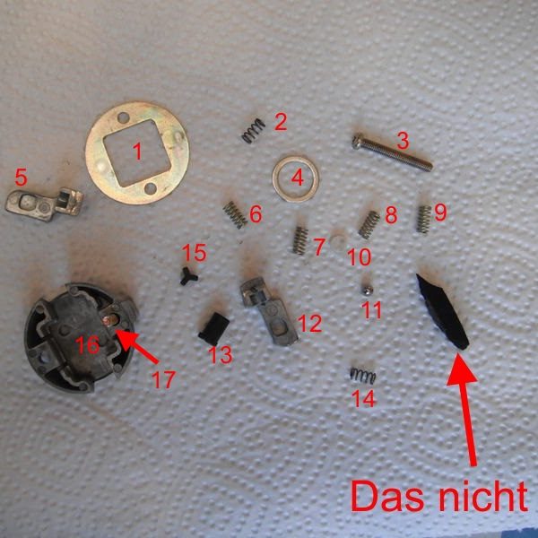 Ein mir jetzt auch bekanntes Problem ist, dass sich die Schrauben an der Unterseite des Tankdeckels lösen können. Dann zerfällt die Mechanik und es purzeln einige Teile in den Tank. Einige heißt konkret: 17!